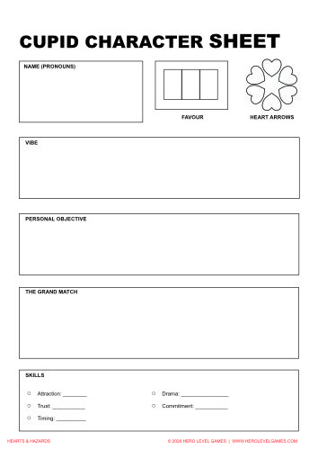 Hearts & Hazards is a rules-light, replayable d6 tabletop roleplaying game (TTRPG) built for one-shots, short campaigns, and convention play. Designed around romantic comedy chaos, dramatic timing, and emotional escalation, it’s a narrative-focused one-shot RPG where failure is fuel and love stories are forged under pressure.
