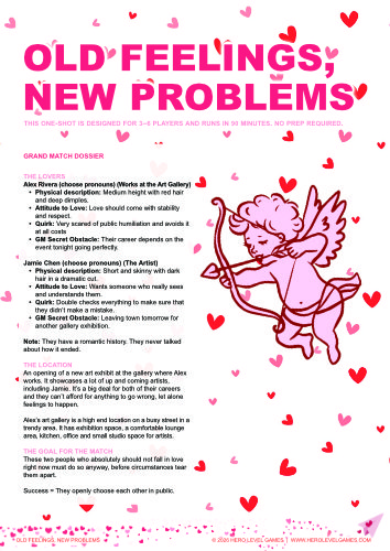 Old Feelings, New Problems is a no-prep, 90-minute romantic chaos one-shot for 3–6 players, designed for fast play, public confessions, and exquisitely bad timing.
